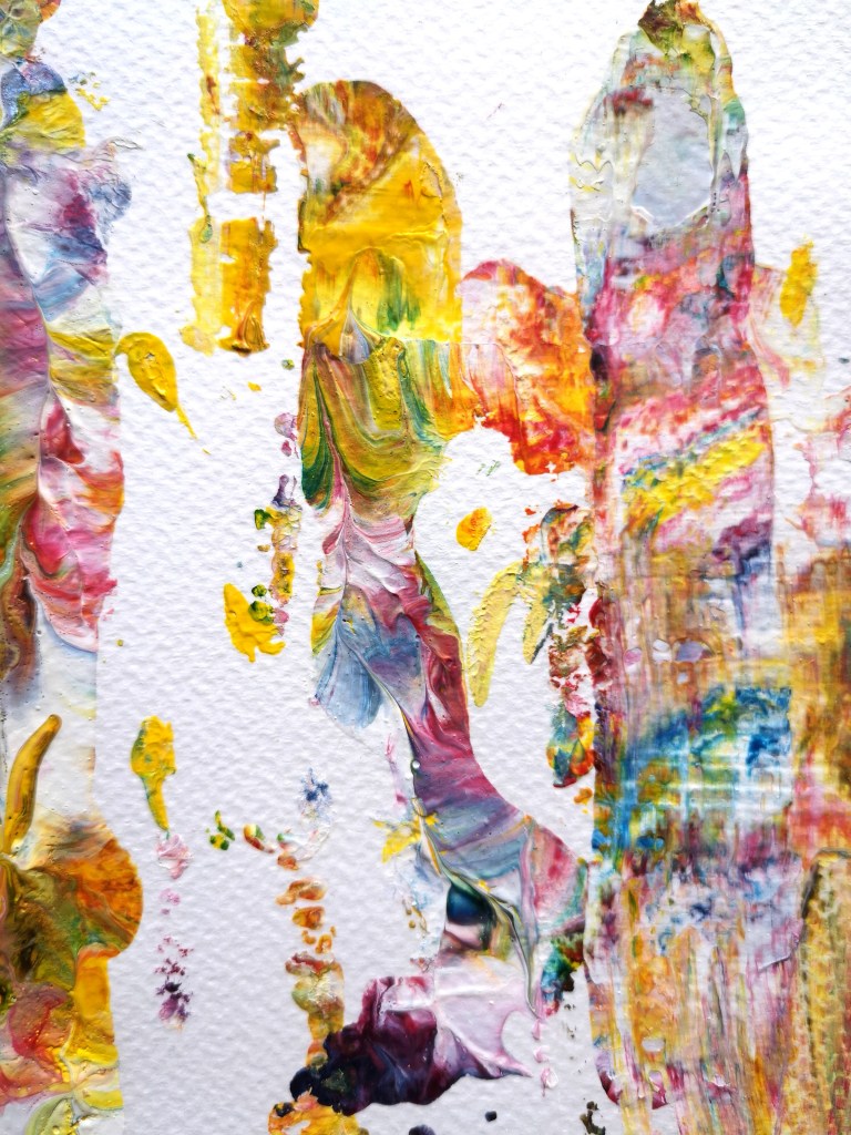 In this abstract work on paper, a range of colours deriving from primaries have been mixed to form a fluid danse. One can see figures or animals emerging, and even an anamorphosis.