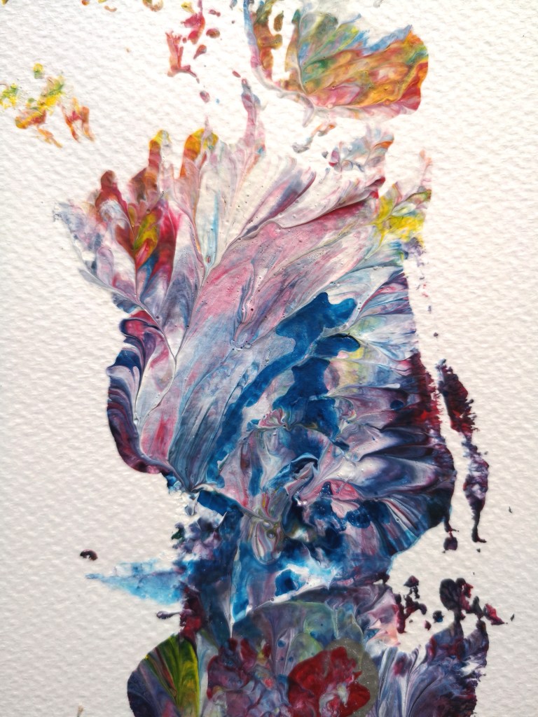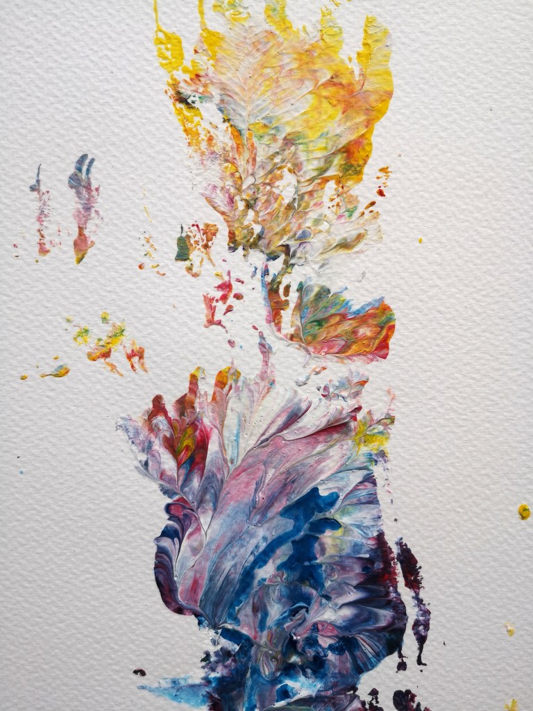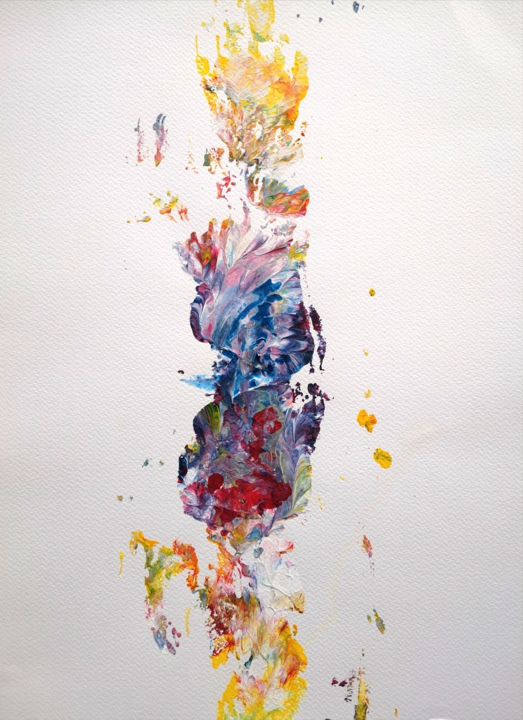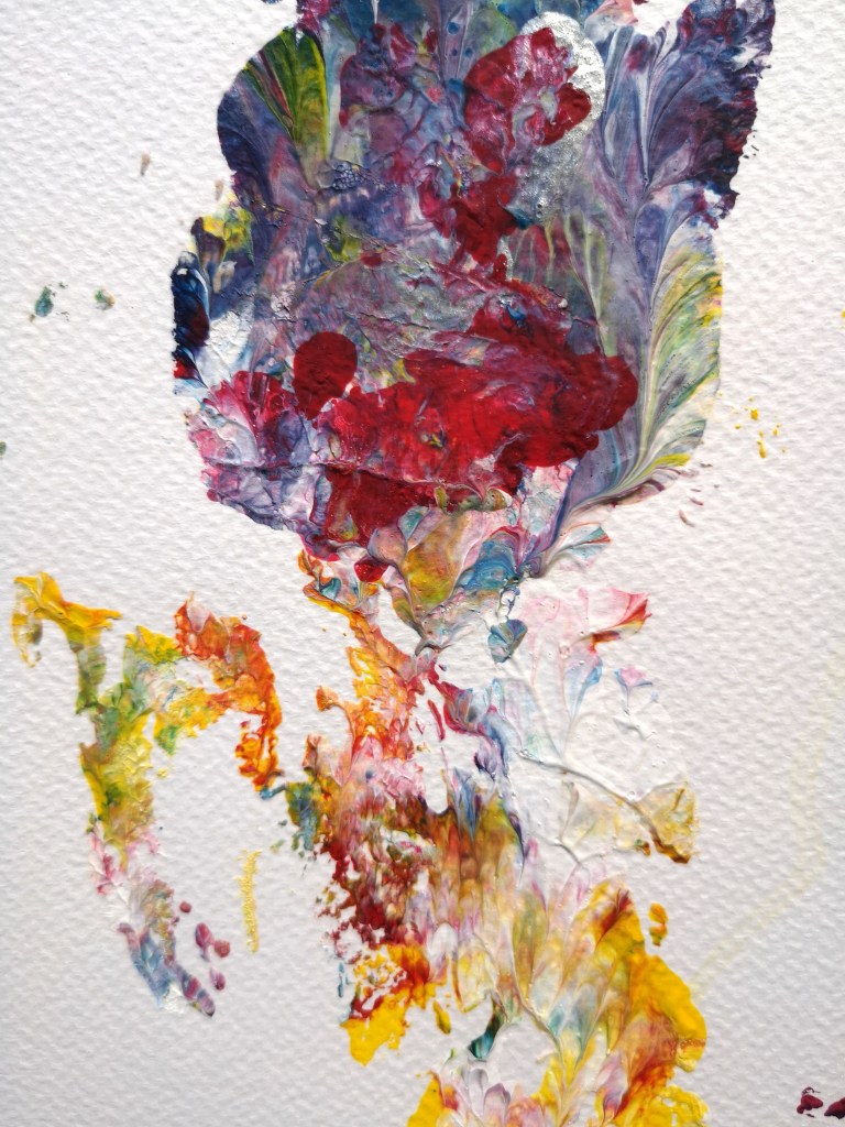 In this abstract work on paper, a range of colours deriving from primaries have been mixed to form a fluid danse.
